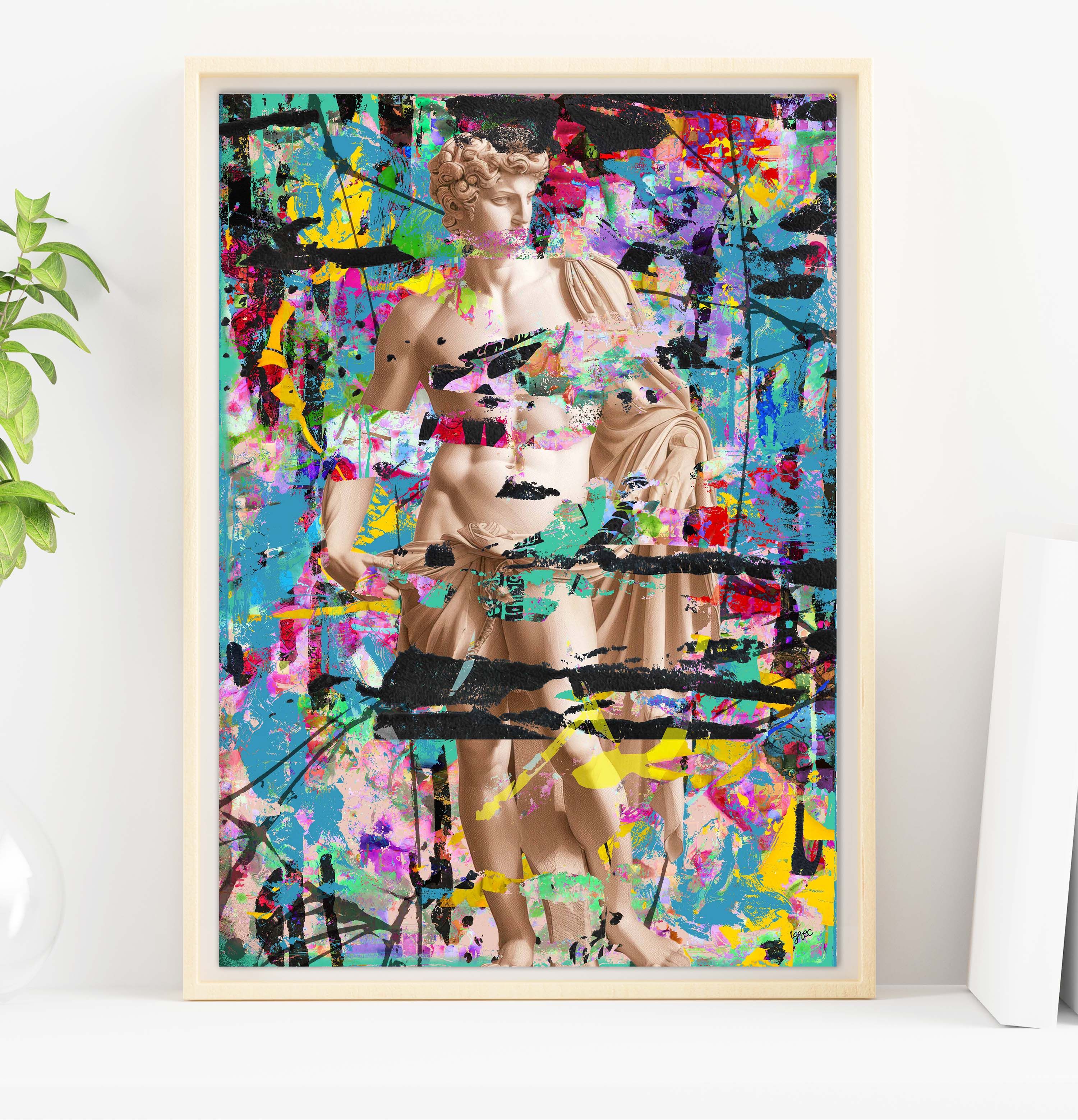 Des figures mythologiques et statues classiques fragmentées puis réinterprétées en estampes numériques, entre sacré et modernité, où l’héritage antique se confronte à une écriture graphique urbaine et vibrante.